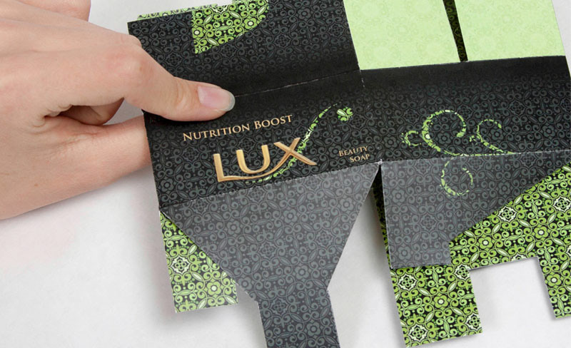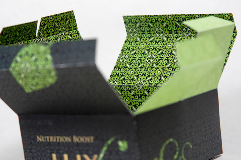 The six wide tabs close the package securely. As the package is opened, the vitalizing color change throughout the layers makes the bath beads more inviting.