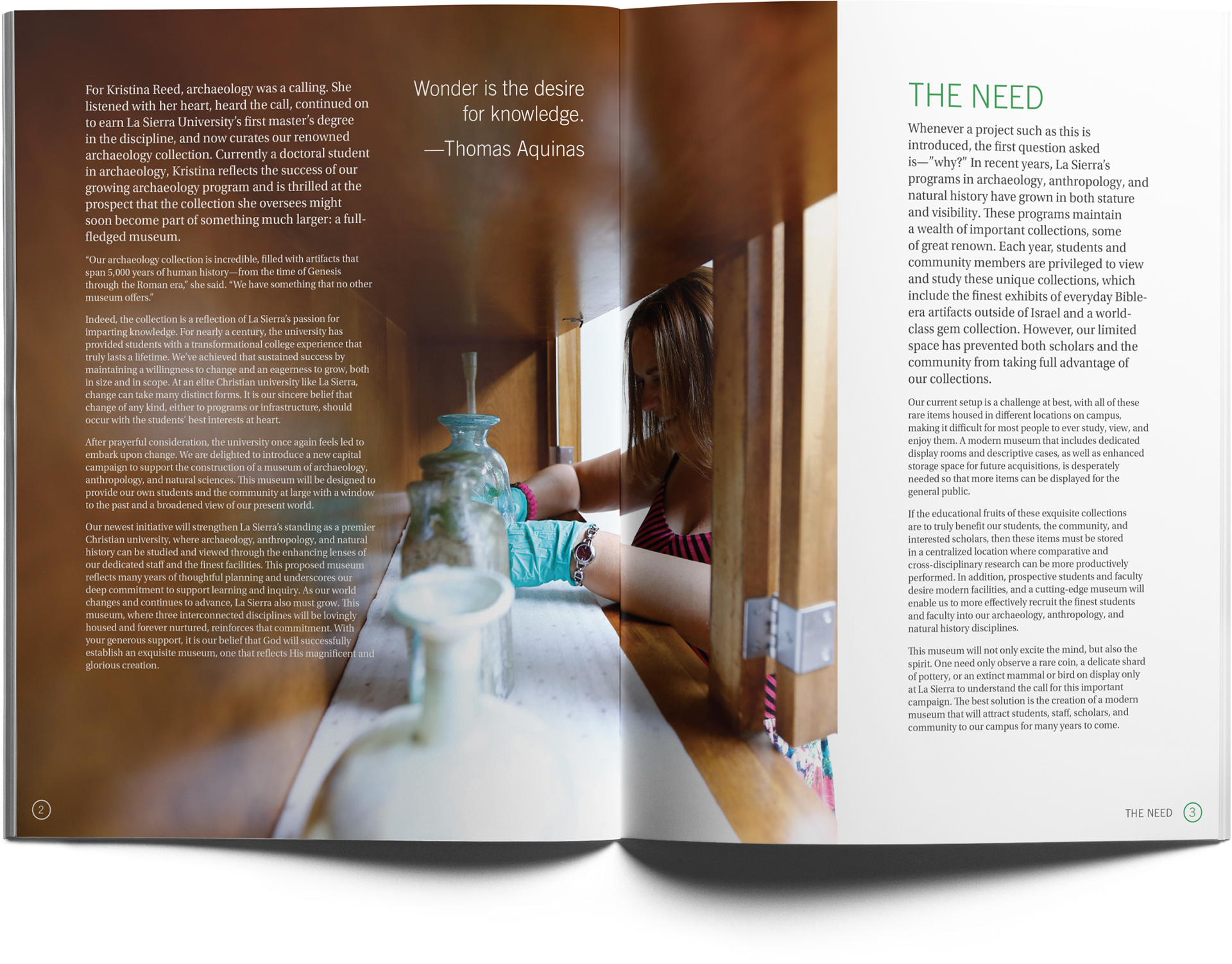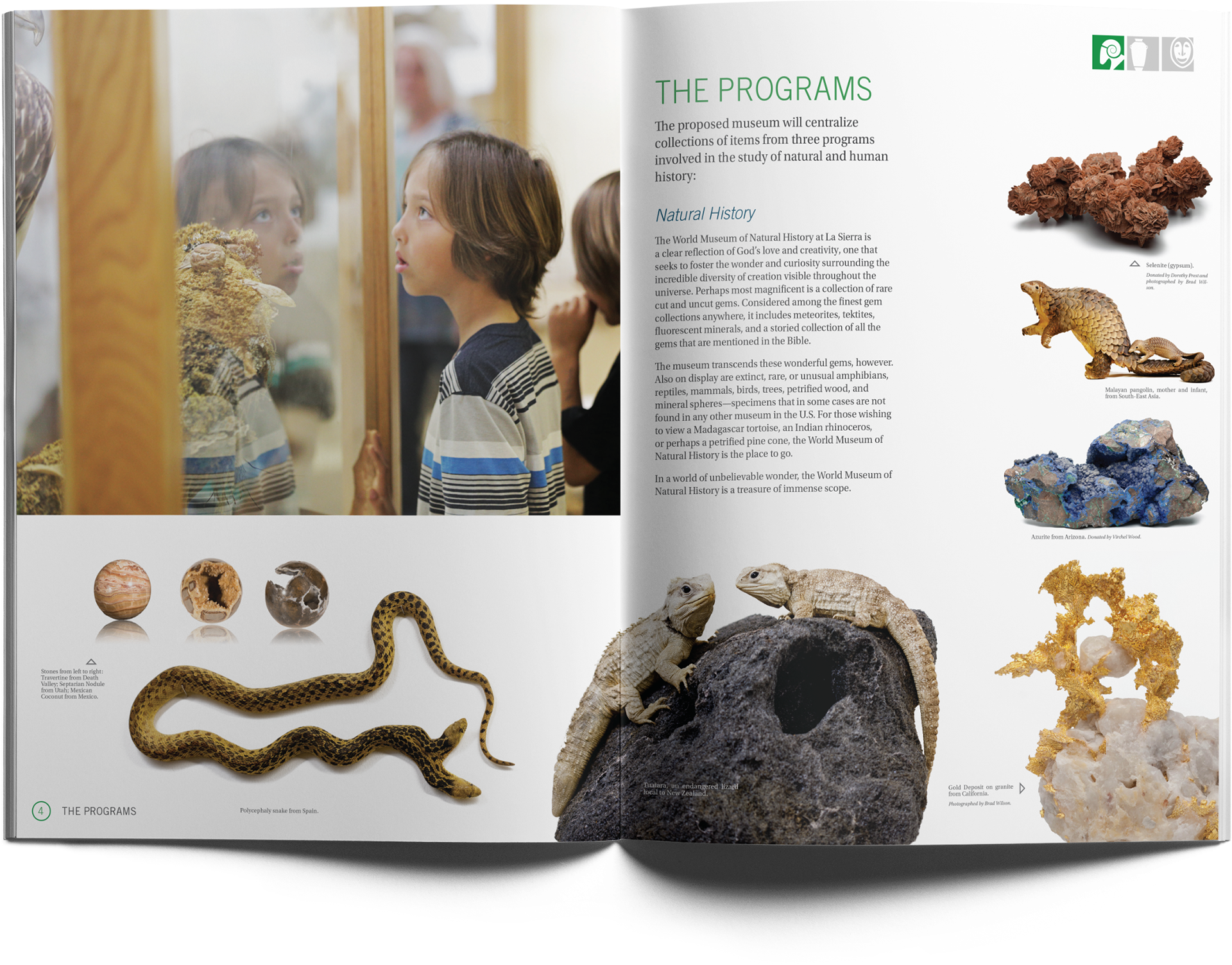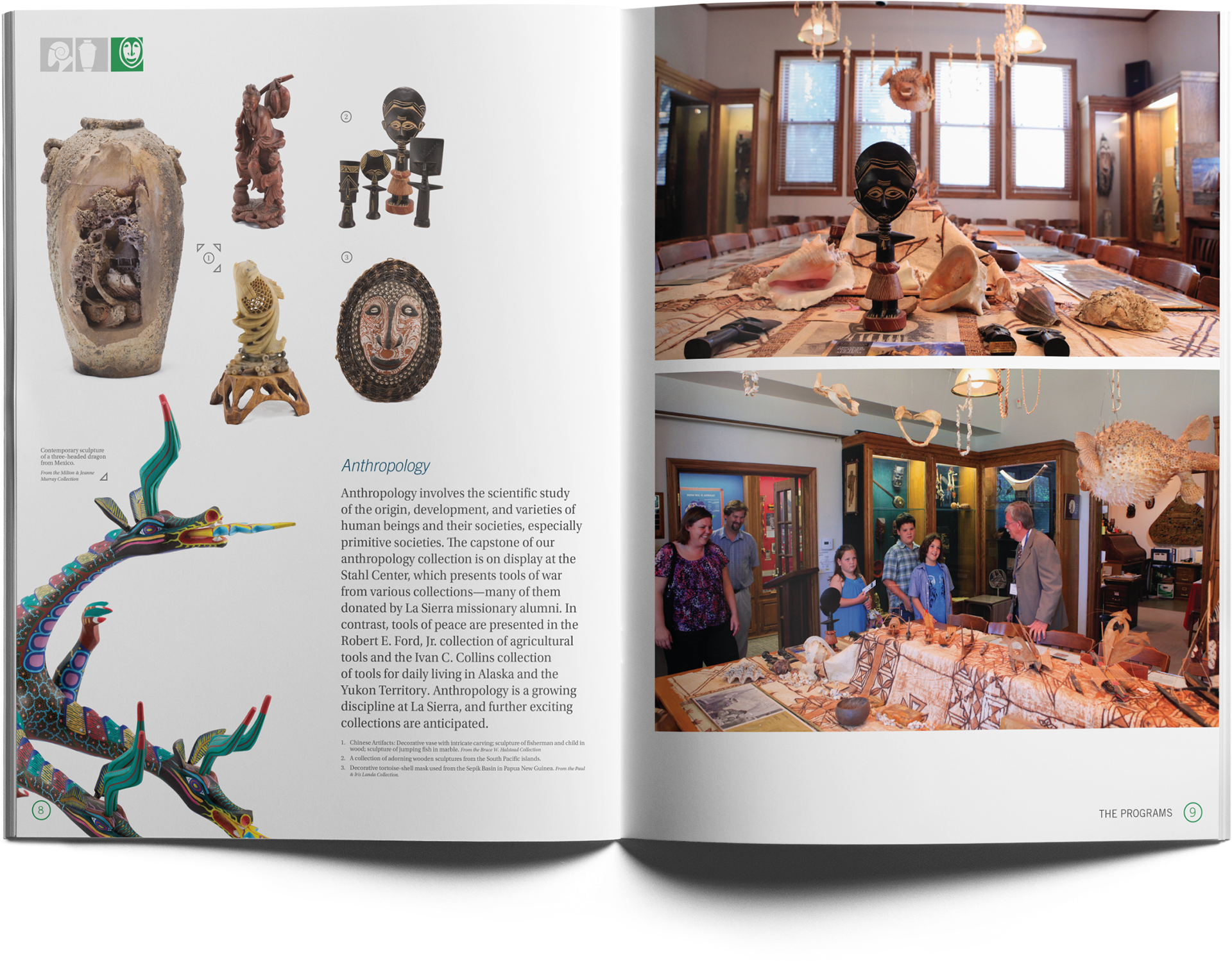 museum holding the various artifacts depicted in the case for support. One way I helped unify the collections was to create three icons, each representing a specific collection, and highlight the one at a time in the section header. On the last page, I then created a collage with the three icons surrounded by student images. This parallels the message on the spread.